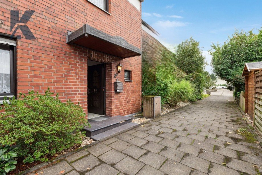 Monheim-Baumberg: großer Garten mit solidem Backstein-Reihenhaus sowie Erweiterungs-Potential